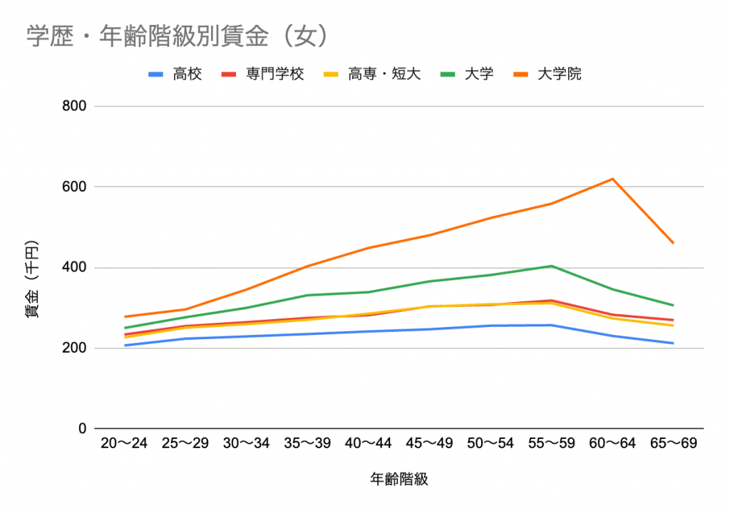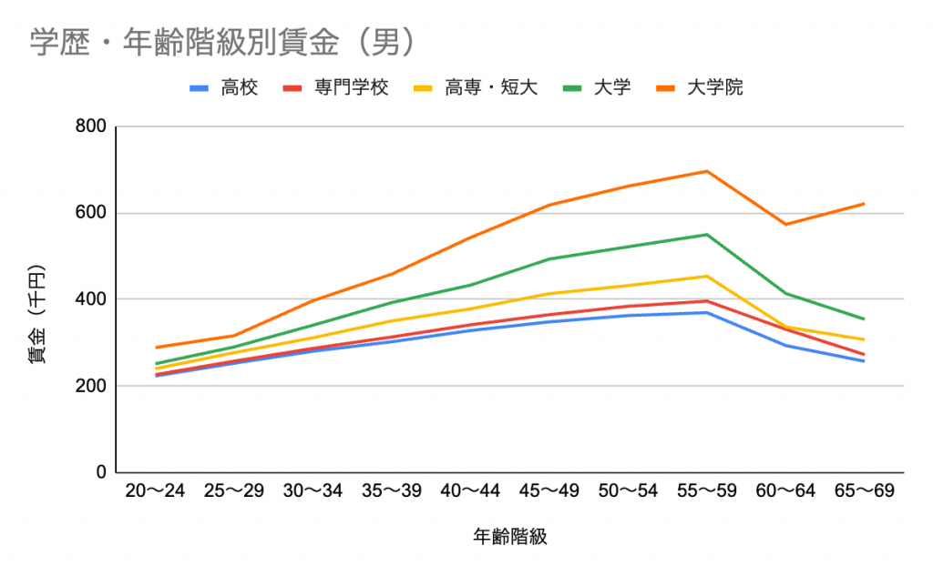 その後わずかに差が縮みますが、院卒のほうが高給であることは変わりません。