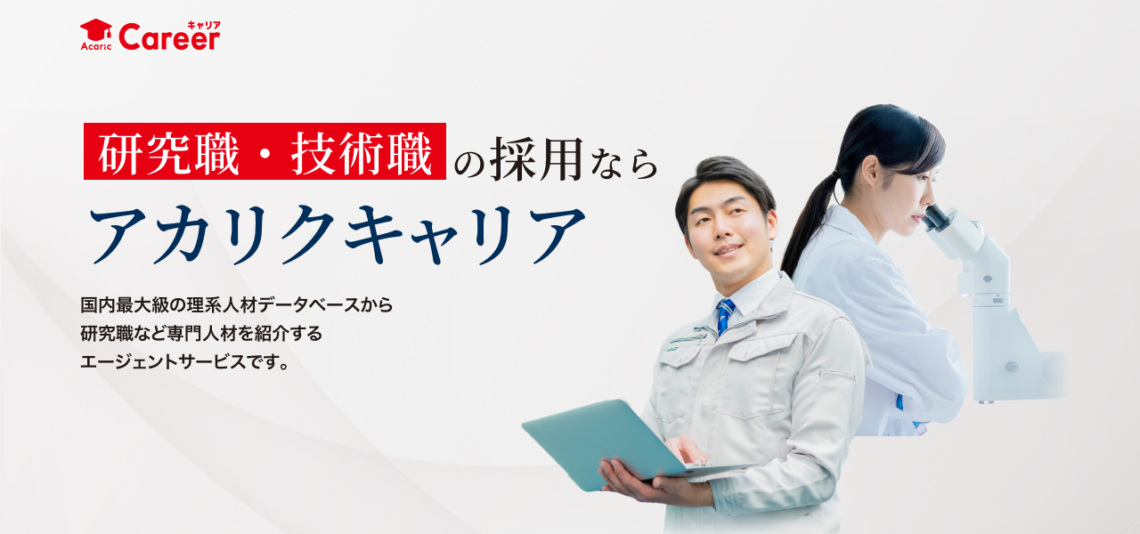 アカリクキャリアは、創業から理系・大学院生に特化した新卒採用支援を行ってきたアカリクが運営する、理系人材の中途採用エージェントサービスです。20万人以上の理系人材が登録する国内最大級のデータベースから、専門コンサルタントが貴社とマッチする人材をお探しします。