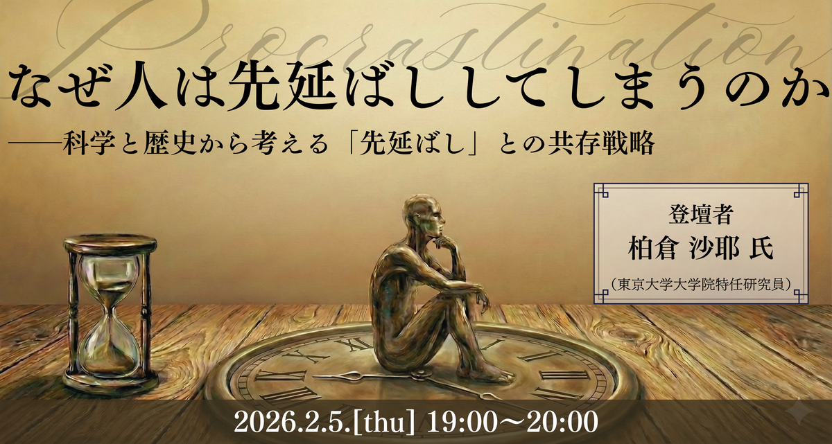 今回は,⼈類の先延ばしの歴史を時間旅⾏しながら,最新科学の知⾒をもとに,先延ばしと共存しつつ⾃分の⼈⽣の舵を⾃分でとるための道標を,⼀緒に探究できると幸いです!
