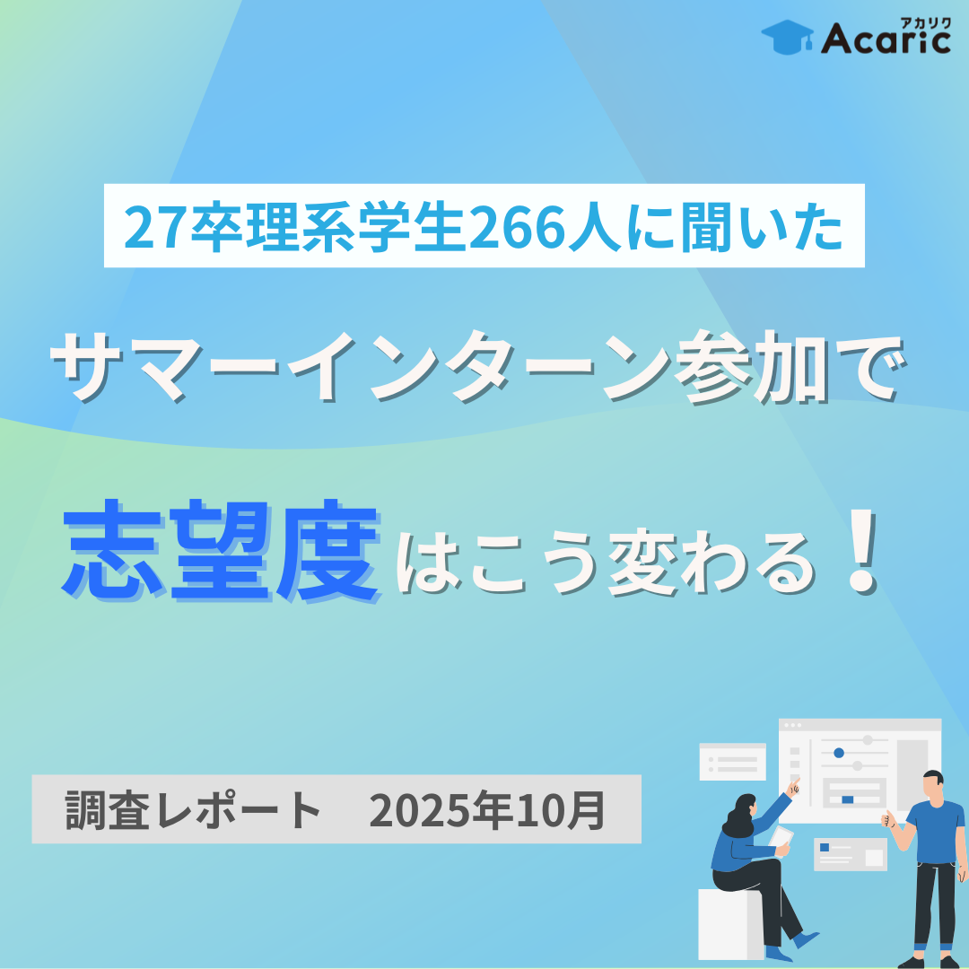 27卒理系学生266人に聞いたサマーインターン参加で志望度はこう変わる! 2025.12.08 27卒理系学生266人に聞いたサマーインターン参加で志望度はこう変わる! この資料でこんなことが分かります 27卒理系学生の夏インターン参加状況 27卒理系学生の夏インターンの振り返り 27卒理系学生の秋冬インターンの参加意向 など