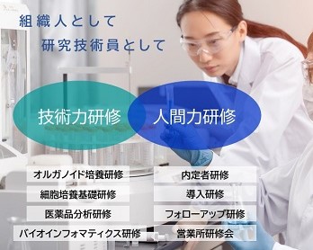 ➀社内技術研修 4つの研修施設で個人にあった研修を実施しています。 配属先でスムーズに業務へあたれるようクライアントからニーズの高い技術を中心にカスタマイズされた研修です。 【医薬品分析研修】 医薬品分析(理化学試験)全般 GMP教育 日本薬局方(通則) 安全教育(初心者の心得。MSDS教育) HPLC操作 【細胞培養基礎研修】 動物細胞の培養 タンパク関連実験 核酸関連実験 安全教育 BSL、カルタヘナ 【オルガノイド培養研修】 マウスの解剖と初代オルガノイド培養、継代、凍結 マウスがん化オルガノイドの培養と担癌マウス作製 ヒトがんオルガノイド培養 【バイオインフォマティクス研修】 Linuxの基本操作 Paythonコードの理解 NGS解析の知識・技術 統計解析(統計検定3級~2級レベル) ➁クライアント協業技術研修 弊社研究社員が配属されているクライアント様の研究所内で実施する技術研修。数カ月の技術研修を通して実務同様の経験習得が可能です。