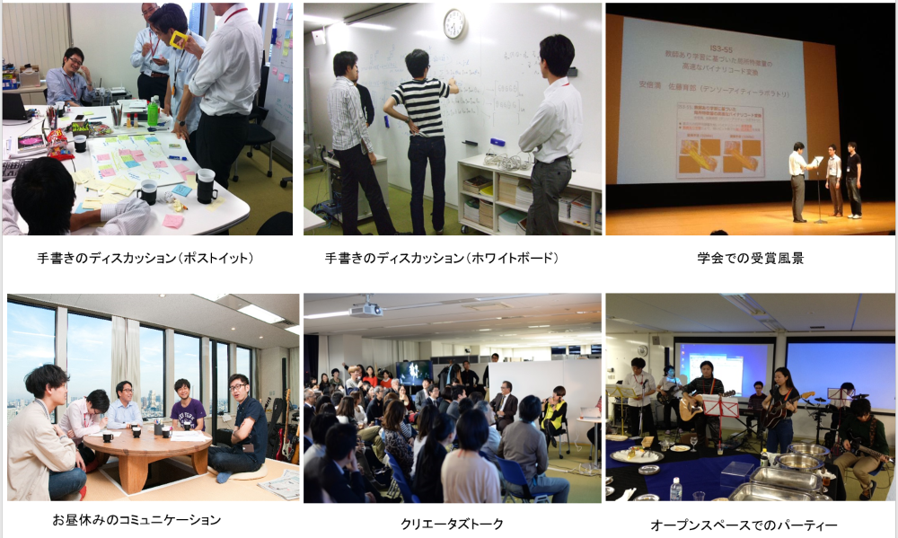 ■今まで経験してきた研究内容を考慮しながら取り組むテーマを相談し、新しいことにもチャレンジできる風土です。生涯、研究者を謳い、テーマに向けた社員の専門性、思い入れを大切にします。 ■情報発信、技術研鑽に向けて学会活動を重視。トップカンファレンスでのアクセプトを目指して研究にチャレンジしています。最新の技術トレンドをキャッチするアンテナ機能として学会聴講も活発に行っています。 ■デンソーグループならではの強みを活かし、デンソーと密に連携して研究成果を世の中に送り出しています。自動車の枠を超えた研究テーマも複数取り組んでいます。 ■多様な人・技術の交わりを活発化させ、研究者としての切磋琢磨、新しいアイデア・発想が生まれる仕組みを随所に設けています。アルコールを入れる場もあり堅苦しくなく自由な雰囲気で、ワイワイガヤガヤとコミュニケーション、論戦が進みます。 ■担当する研究テーマに応じて、各グループに属しますが,実質的な仕事は,グループの枠にまったく規制されません。研究者同士、個人間の話し合いで、グループの枠を越えた新しいテーマがどしどし生まれています。