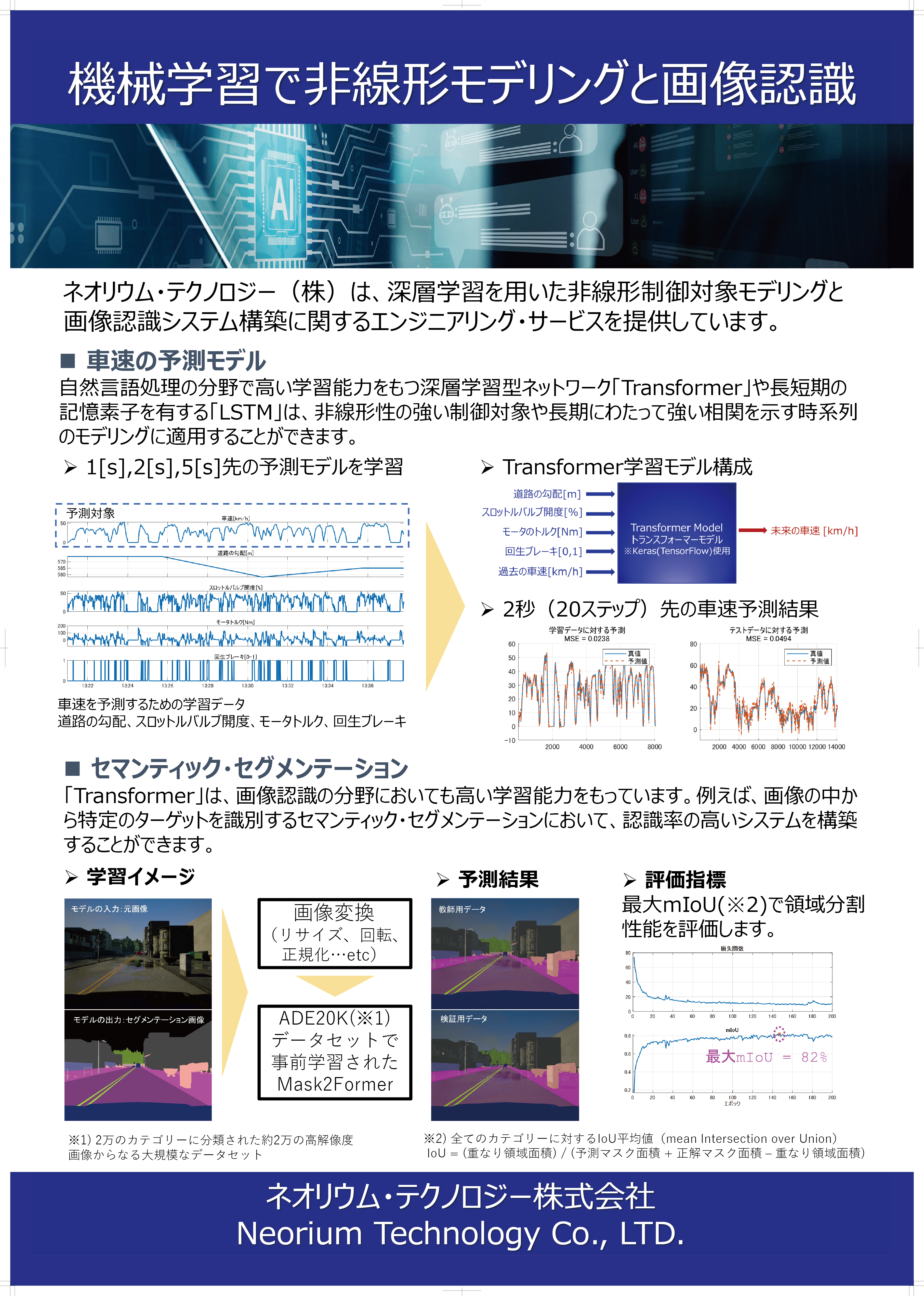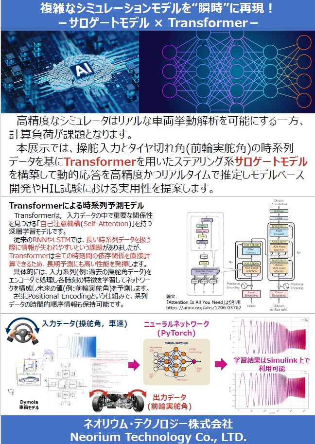 【Transformerによる時系列予測モデルの優位性】 私たちは、操舵入力とタイヤ切れ角(前輪実舵角)の時系列データを用いて、 Transformerベースのステアリング系サロゲートモデルを構築しました 。 このモデルは、動的応答を高精度かつリアルタイムで推定することができ、 モデルベース開発やHIL(Hardware-in-the-Loop)試験での実用性を高めます 。 【Transformerとは】 Transformerは、深層学習モデルの一種であり、 入力データの中で重要な関係性を見つける、 「自己注意機構(Self-Attention)」という特徴を持っています 。 従来のRNNやLSTMといったモデルでは、 長い時系列データを扱う際に、 情報が失われやすいという課題がありましたが、 Transformerは全ての時刻間の依存関係を直接計算できるため、 長期予測においても高い性能を発揮します 。 具体的には、 入力系列(例:過去の操舵角データ、車速)をTransformerに入力し、 各時刻のタイヤ切れ角を学習するネットワークを構成することで、 未来の値(例:前輪実舵角)を予測します 。 このTransformerは、 2017年の先駆的な論文「Attention Is All You Need」で提案されたアーキテクチャに基づいています 。 【AIとシミュレーション技術の融合】 サロゲートモデル開発は、当社が販売している制御対象モデル構築用ソフトウェア「Dymola」などの車両モデルから得られるデータ(入力データは操舵角、車速、出力データは前輪実舵角)を活用し、Transformerベースのニューラルネットワーク(PyTorchで実装)で学習を行うことができます。その学習結果は、モデルベース開発で使用されているMATLAB/Simulink上で利用可能となり、迅速かつ高精度なシミュレーションを実現します 。 この技術は、 自動車開発の現場において、 より迅速な設計サイクルと効率的な検証プロセスを可能にします。 計算負荷の高い詳細なシミュレーションをリアルタイムに再現できることで 、 開発のボトルネックを解消し、品質向上とコスト削減に貢献します。