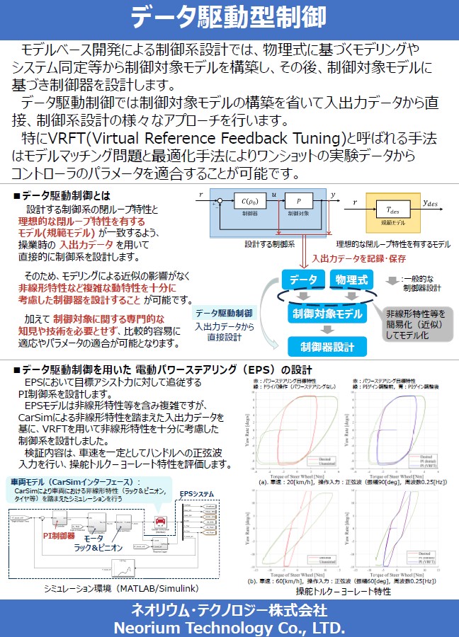 ❖データ駆動制御の概要と 電動パワーステアリングへの応用 ~~~~~~~~~~~~~~~~~~~~ 【データ駆動制御とは?】 データ駆動制御は、従来のモデルベース制御とは異なり、制御対象の物理モデルを構築せずに、入出力データから直接制御系を設計する新しい制御アプローチです。従来のモデルベース開発では、システムの複雑な特性を単純化・近似する必要がありましたが、データ駆動制御では非線形特性などの複雑な動特性を考慮した制御器設計が可能です。この手法の大きな利点は、制御対象に関する専門知識がなくても、比較的簡単に制御系の適応やパラメータ調整ができる点です。 【VRFT(Virtual Reference Feedback Tuning)】 データ駆動制御の一手法であるVRFT(Virtual Reference Feedback Tuning)は、一度の実験データからコントローラのパラメータを調整できる効率的な手法です。この手法は、設計する制御系の閉ループ特性が、理想的な閉ループ特性を持つ規範モデルと一致するように、実際のフィードバック制御時のデータを用いて直接的に制御系を設計します。 【電動パワーステアリング(EPS)への応用事例】 データ駆動制御は、複雑な非線形特性を持つ電動パワーステアリング(EPS)の制御設計に有効です。シミュレーションツール「CarSim」で非線形特性を考慮した入出力データを生成し、VRFTを適用することで、PI制御系を設計できます。 検証では、車速20km/hと60km/hの条件下で、ステアリングに正弦波入力を加える実験が行われました。その結果、VRFTによって調整されたPIゲインを持つシステムは、目標とするパワーステアリング特性(理想的な挙動)を高い精度で再現しました。これは、データ駆動制御、特にVRFTが、複雑な非線形システムに対しても効果的な制御性能を発揮できることを示しています。