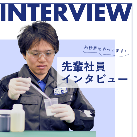 1. プロフィール 所属部署:開発本部 プロダクトデザイン部 入社年:2025年 専攻:理工学専攻 2.学生時代の就活の軸は? 福利厚生と研究開発を広く経験できる環境を軸にして探していました。「研究」よりも、研究成果を実際の製品につなげていく「研究開発(応用研究~開発)」をやりたいと思っていました。また、卓上での実験だけは飽きるだろうなと思っていたので、幅広く業務に携われるところを探していました。 3. やりがいは何ですか? 開発のメンバーだけだったら関わる幅が狭くなるんですけど、顧客・製造・営業など多くの人と関わることができるので、知識だけでなく人間性でも学べるところがあって面白いなと思っています。あとは、先輩から「これやってみようか」と、新しい処方での開発や、プロジェクト以外の仕事を任せてもらえるのはやりがいを感じますね。 4. テクノフローワンに入社した決め手は? 就活の軸だった、幅広い業務に携われる環境があると感じたからです。 また、温かみのある雰囲気が自分は好きでした。大企業だと堅苦しいというか、自分には合わないと思って。 5. テクノフローワンで得られる価値とは? 若いうちから広く色々なことを学べることですね。1年目から様々な経験をしました。中小だからこそ役職者と距離が近いし、重要な会議に出席できるため、リアルタイムで細かく知ることができることや、いろいろな製品に関わることもできています。個人個人にもとめられる仕事があるからスキルアップが早くできるところは良かったですね。たまに頭がパンクしそうになりますけど(笑) 6.今後目指しているものは? 下期からやっているプロジェクトでは、まだ先輩の後ろについていくことが多く一人でできるようになりたいと思っています。将来的には環境配慮型素材の開発をしたいです。もともと小学生の時に環境問題の話を頻繁に耳にしていたことが化学に興味を持ったきっかけで。まずは既存のものを環境に配慮したものに置き換えたいと思っています。 7. 就活生へのアドバイスはありますか? まずは研究を全うすることが大事だと思います。実験計画をたてる、同時並行にやろうとスケジュール管理をすることは入社してからも大事ですから。あとは、さまざま部署の人と関わるので、日頃からコミュニケーションを意識するといいんじゃないかと思います。
