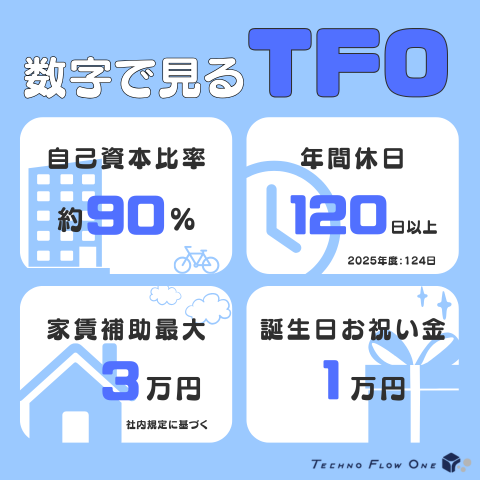 【圧倒的な安定基盤で安心して働ける】 自己資本比率 約90%の高水準。 強固な財務体質を誇る当社だからこそ、長期的に安心してキャリアを築けます。 【年間休日120日以上でメリハリある働き方】 年末年始、GW、お盆期など、しっかり休める環境でプライベートも充実。 オンとオフの切り替えができるから、仕事に集中できます。 【家賃補助 最大3万円!生活をサポート】 毎月の家賃を会社が補助。一部引っ越し費用も負担します。 安心して新生活をスタートできる手厚い福利厚生です。 【誕生日お祝い金 1万円支給】 社員一人ひとりを大切にする文化があります。 誕生日は、会社からの“ありがとう”を贈ります。 そのほか暑気払い、BBQ、忘年会の参加費無料のイベントもあります! 詳しくは面談でご確認ください。