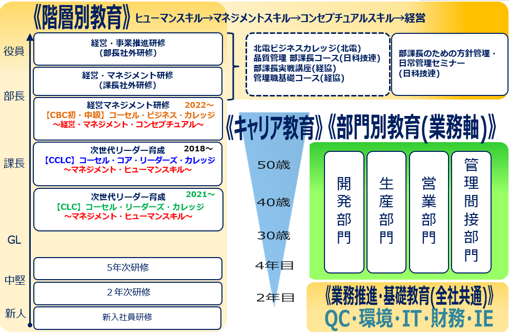「人」は会社における最も重要な財産であり、「人財」育成こそが社業発展の原動力である。 という教育理念を掲げ、体系をつくっています。 キャリア教育を軸とし、自律的キャリア形成を社員に目指してもらっています。 それを肉付けしていく形で各種教育を展開しています。