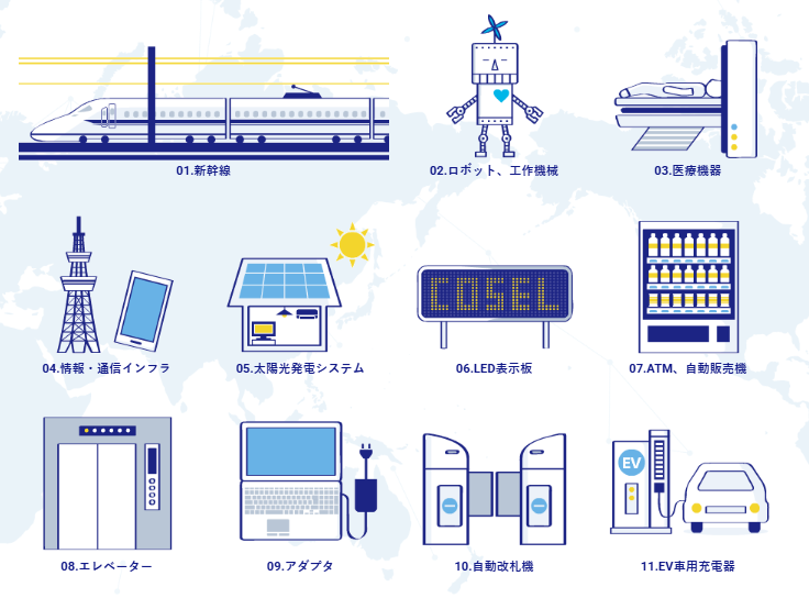 家電やコンピュータ、エレベータや電車など、世の中には実に多くのエレクトロニクス製品があります。 言うまでもないことですが、それらエレクトロニクス製品は、電気エネルギーで動いています。 外部から電気を取り入れ、モーターやICに供給することで、エレクトロニクス製品は動きます。 「電源」は、電気エネルギーを取り入れ、様々な部品に供給するためになくてはならない部品。 世の中にある、ありとあらゆるエレクトロニクス製品で必ず使われている部品です。