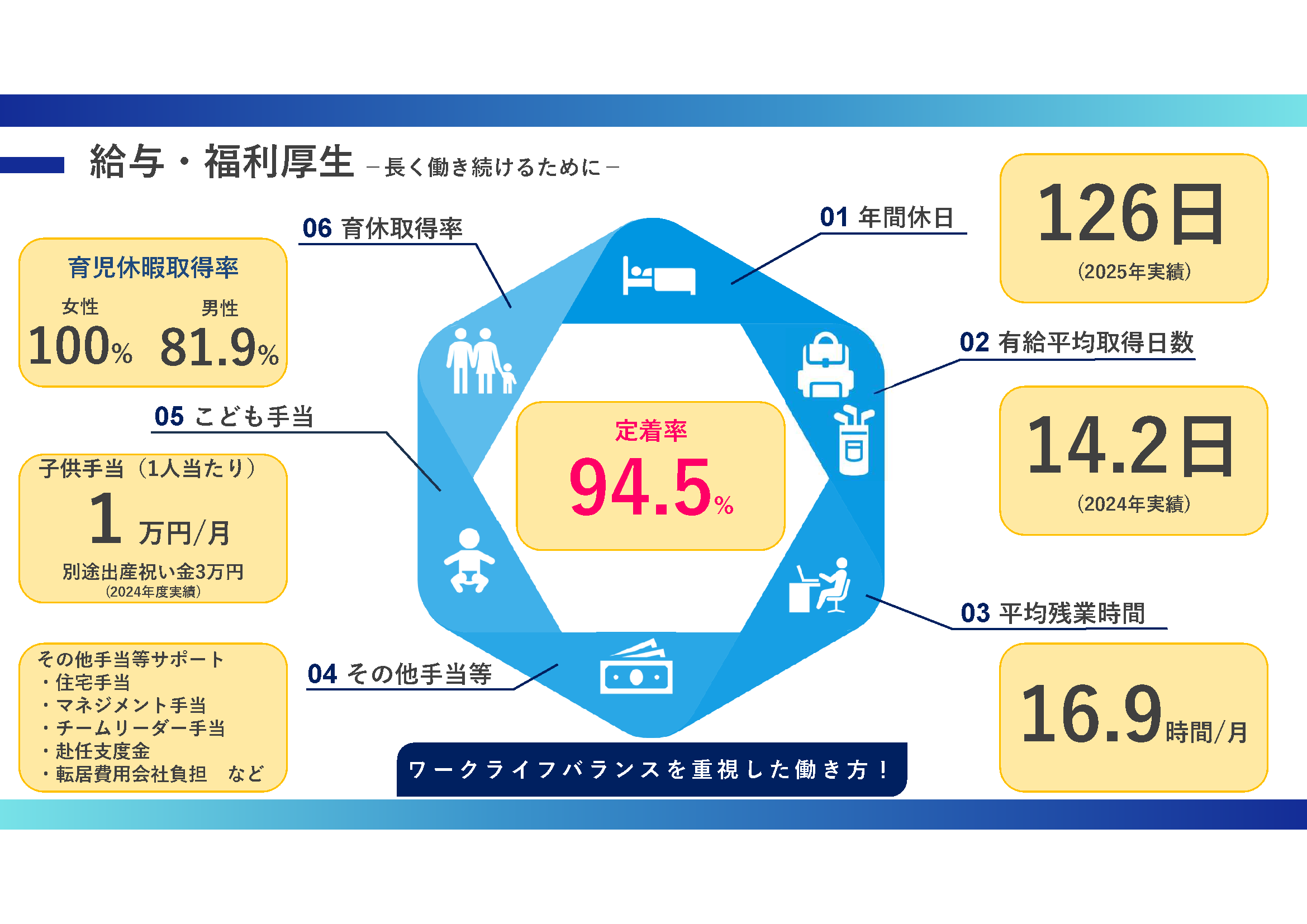 当社では、社員一人ひとりが安心して長期的にキャリアを築けるよう、安定した経営環境と充実した福利厚生制度を整えています! ・プラチナくるみん認定企業 ・業種別人気企業ランキング3年連続1位 ・安定した経営環境(東証プライム市場上場、昨年過去最高業績更新) ・年間休日126日、残業時間平均16.9時間/月でプライベートとの両立を実現。 ・平均取得有給日数14.2日 ・初任給8年連続アップ ・人を大切にする社風(創業以来リストラなし) 「働きやすさ」と「成長のしやすさ」の両立を目指した環境が、当社の強みです!