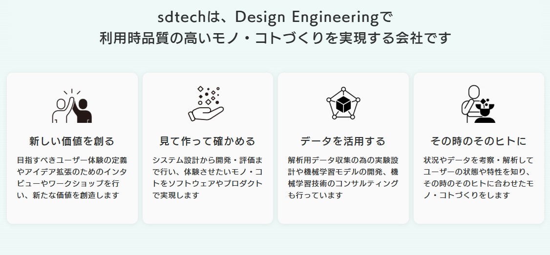 デザイナーとエンジニアリングの共創により実現する、利用者(ユーザー)が使いやすいと感じる製品・サービスの創出! 顧客から依頼されたことをそのまま実行する、というモノづくりでは感じられないやりがいを感じていただけるはずです。 ユーザーという“人”について考えることで実際にそのプロダクトが使用される場面を常にイメージし、それを形にすることに自分が力を発揮しているんだという実感が得られます。 この実感を、デザイン・エンジニア・機械学習など様々なバックボーンをもつメンバーとともに、クリエイターとして感じられる楽しみ、魅力が、当社には溢れています。