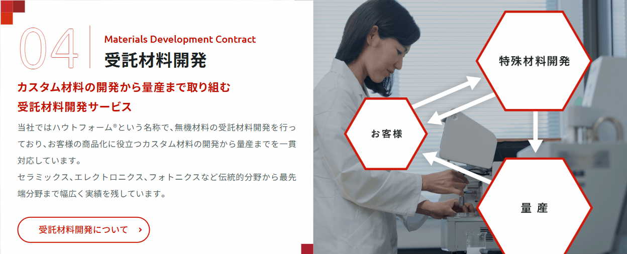 当社ではハウトフォーム®という名称で、無機材料の受託材料開発を行っており、お客様の商品化に役立つカスタム材料の開発から量産までを一貫対応しています。 セラミックス、エレクトロニクス、フォトニクスなど伝統的分野から最先端分野まで幅広く実績を残しています。