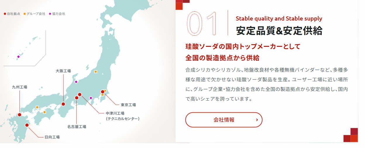 合成シリカやシリカゾル、地盤改良材や各種無機バインダーなど、多種多様な用途で欠かせない珪酸ソーダ製品を生産。ユーザー工場に近い場所に、グループ企業・協力会社を含めた全国の製造拠点から安定供給し、国内で高いシェアを誇っています。