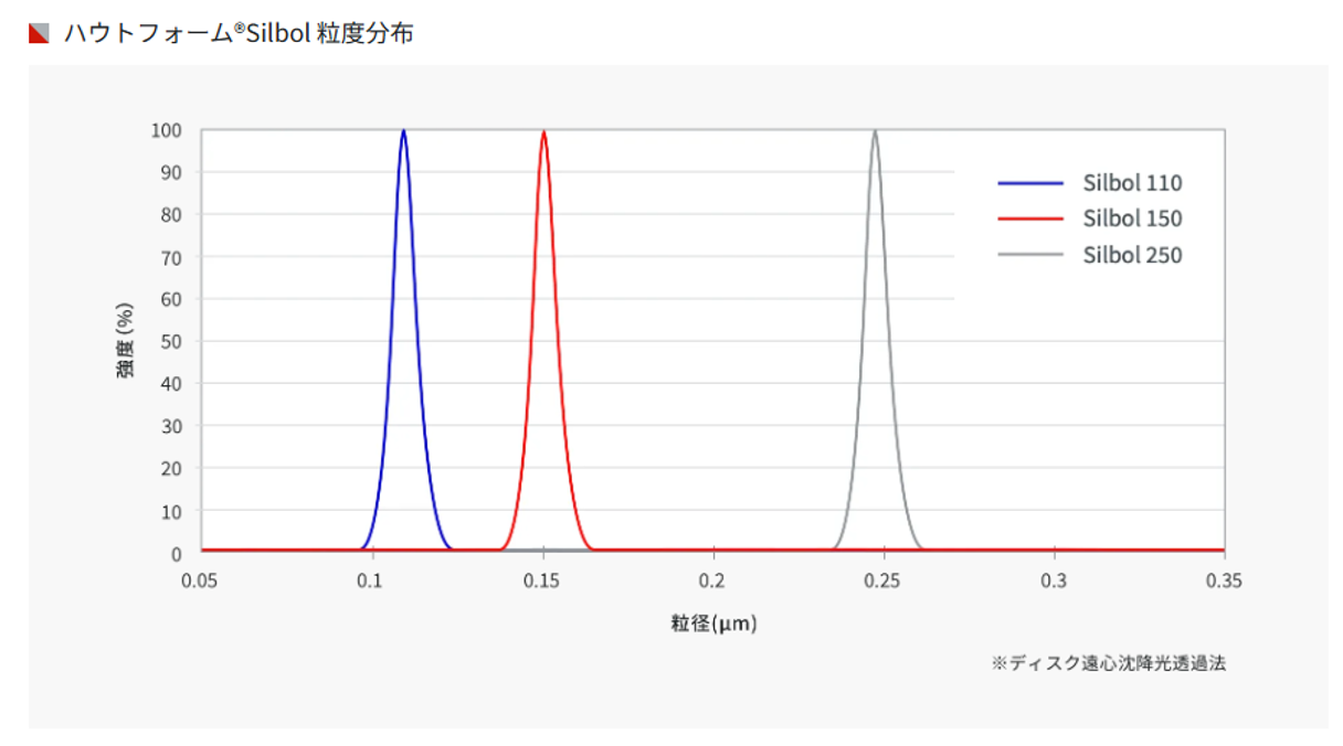 ハウトフォーム® Silbolはケイ酸ソーダ(水ガラス)を出発原料にした単分散球状シリカ粒子です。製法には積層法を採用し、nmレベルでの粒径制御およびバラツキ制御ができます。