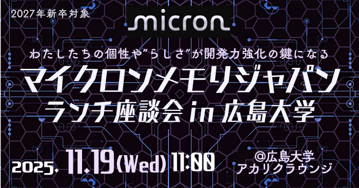 半導体業界のグローバルリーディングカンパニー「マイクロンメモリジャパン」がランチ座談会イベントを広島大学のアカリクラウンジで開催します!