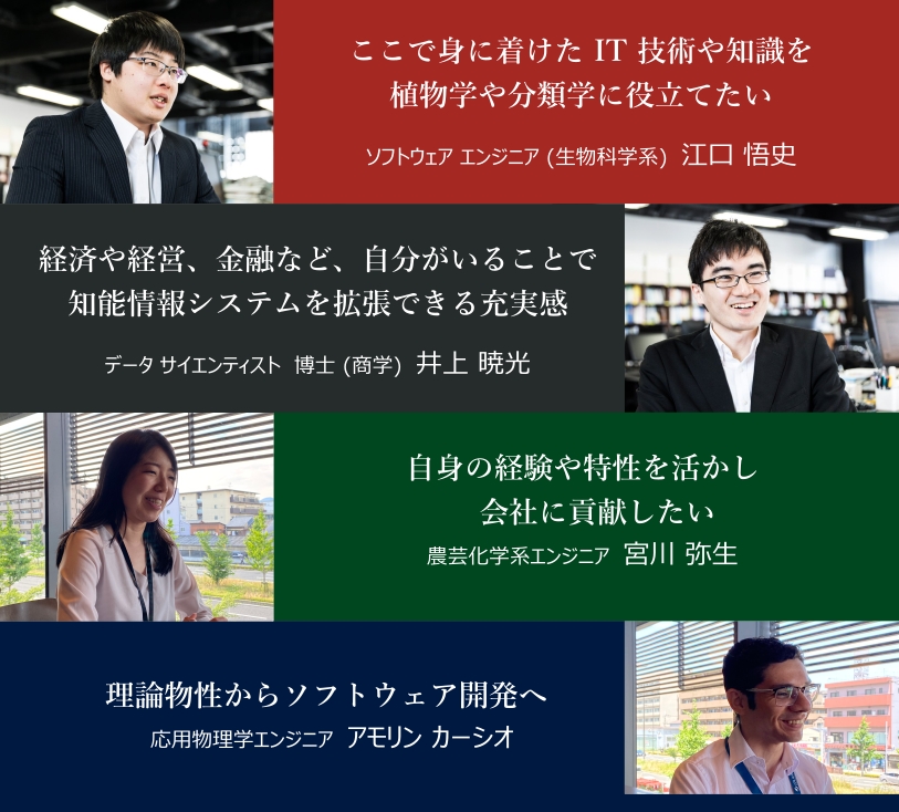 当社のお客様は大学や研究機関の研究者の方、あるいは、企業の研究開発部署に所属する研究開発者の方です。そのため、ご依頼いただく案件は、専門的な知識や研究経験、高度なスキルや数理的な素養を求められることが多くあります。 当社には、情報工学、経済学、心理学、医学、生命科学、物理学、化学などの幅広い分野のエンジニアが在籍し、専門性を活かしながらこのような案件に携わっています。 当社のエンジニアはお客様と専門的な内容でディスカッションすることができるため、ご依頼の内容やご要望を深く理解することができます。また、自分の専門性や研究経験を活かした提案が行えることから、お客様から高い信頼を得ております。 このように当社では、多様な分野出身のエンジニアが自身の専門性や研究経験を活かし、時には分野の垣根を越えて協力しながらお客様の様々な課題の解決やイノベーションに取り組んでいます。