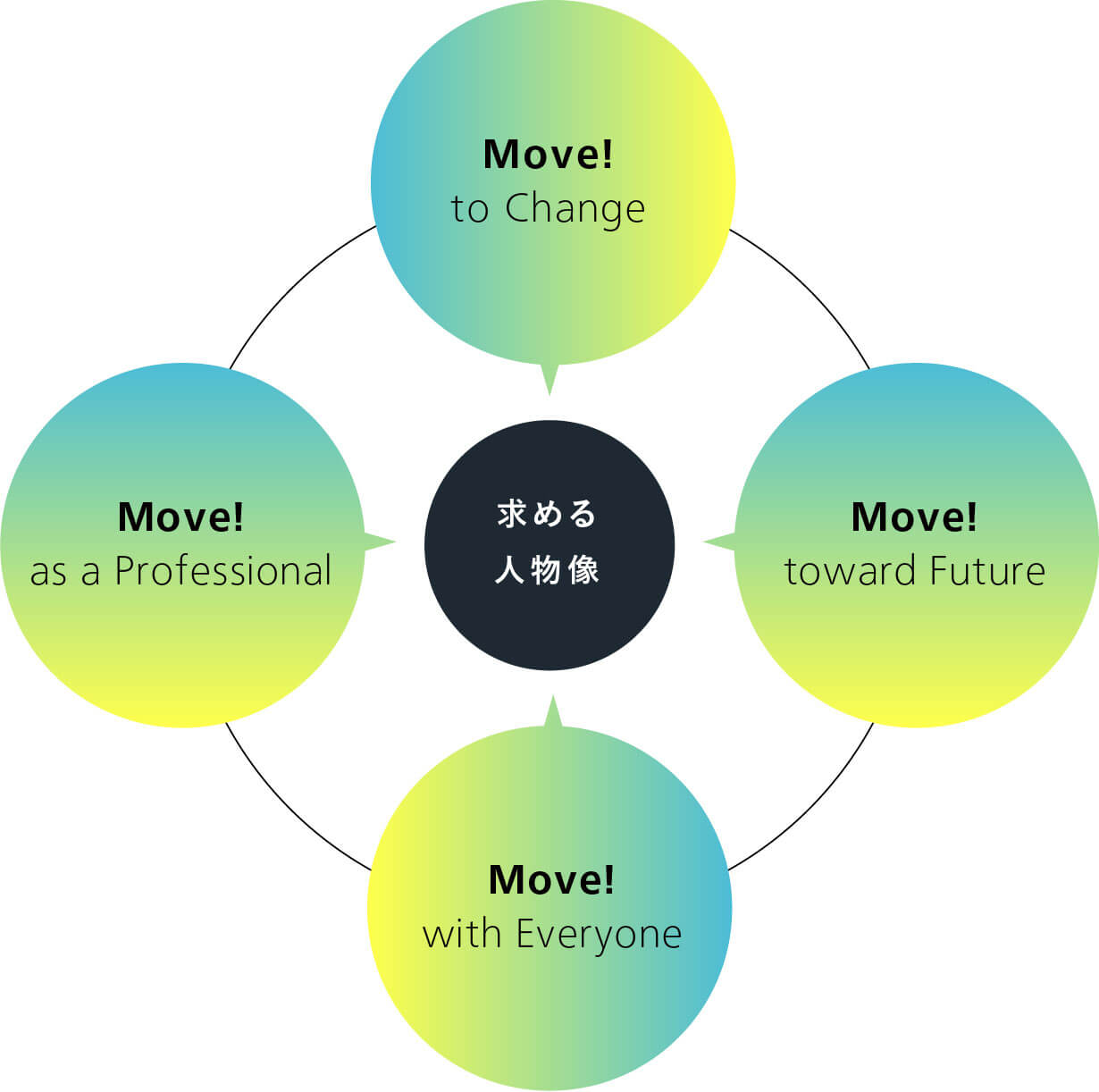 当社はITの会社ですが、ITだけに興味のある人は求めていません。 人間に関心があり、社会に関心があり、ビジネスに関心があり、文化・芸術に関心がある。 そういう幅広さとバランスを持って、かつソリューション事業を通じて社会に役立ちたいという思いのある人を求めています。 また、ソリューション事業は組織戦です。チームワークが大切です。 仲間と力をあわせて何かを成し遂げることに喜びをみいだせる人と一緒に仕事をしたいと思っています。 【Move! to Change】 自身の主体性のもと、周囲を巻き込みながら、新しいことにチャレンジし続けることを意味しております。 【Move! toward Future】 社会課題の本質を捉え、ありたい未来を描きながら、想いをもって進み続けることを意味しております。 【Move! with Everyone】 お互い個性を尊重し、仲間を信じて助け合い、新たな価値を生み出していくことを意味しております。 【Move! As a Professional】 強い当事者意識を持ち、自らをアップデートし続け、社会に貢献していくことを意味しております。