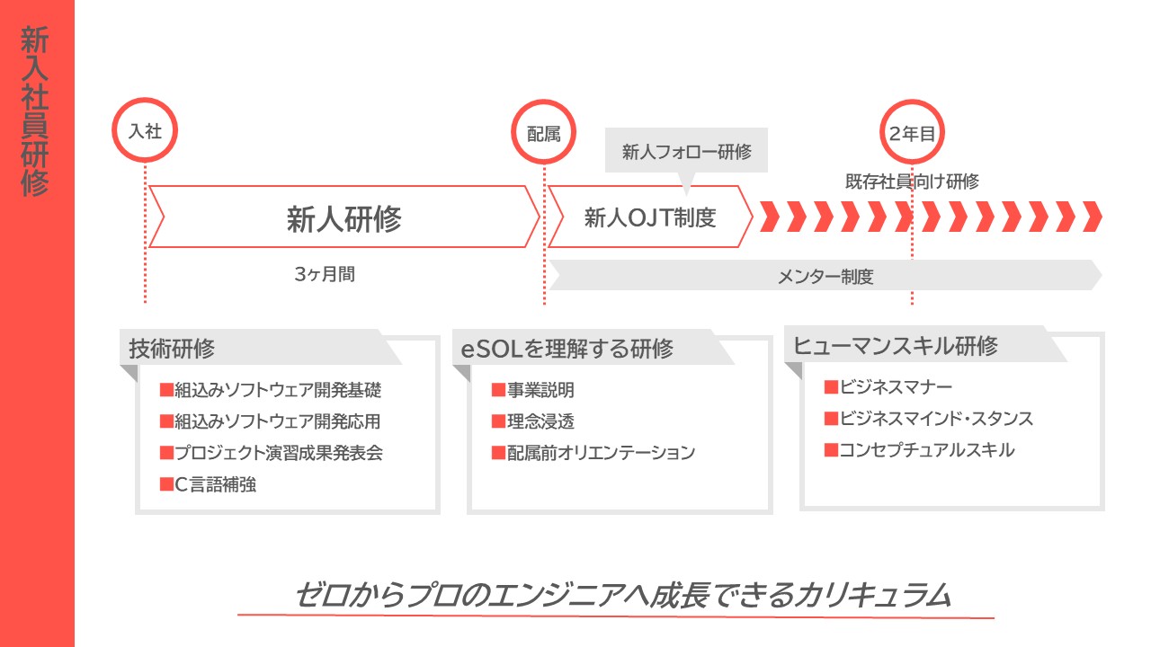 入社後3か月間は、 ◆組込みソフトウェア開発基礎 ◆組込みソフトウェア開発応用 ◆C言語補強 ◆プロジェクト演習成果発表会 ◆ヒューマンスキル研修 …など、しっかりと技術研修メインの【集合研修】を実施します。 7月からは現場配属となり、各現場での【新人OJT研修】に加えて 自部門以外の先輩社員がフォローする【メンター制度】により、 現場定着~活躍まで、様々な角度からサポートします! ※顧客への「ヒアリング」・「要件定義」・「設計・開発」「導入支援」のすべてを手がけるフルスタックエンジニアとしてご活躍いただけるよう、社内全体で支援致しますので、ご安心下さい。