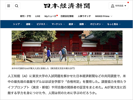 2025年4月6日付の朝刊で、日本経済新聞をはじめ全国34紙に、弊社の取り組みが掲載されました。 本記事では、1月に実施した大学入学共通テストを生成AIに解かせる企画に続き、新たに東大入試を解かせてみる試みを行いました。ChatGPT o1・DeepSeek R1がともに理3合格水準に達したことが、河合塾様の採点協力により明らかになっています。 記事では、以下のようなテーマについて取り上げられています: - 2025年度東大入試における生成AIの実力検証 - ChatGPT o1とDeepSeek R1の答案分析と比較 - 生成AIの進歩と現時点での限界 「東大生レベルの思考に、誰でもアクセスできる時代」の意義 詳しくは、弊社noteで詳細な実験結果をご覧いただけます。 【東大理3合格】ChatGPT o1とDeepSeek R1に2025年度東大受験を解かせた結果と答案分析【採点協力:河合塾】 https://note.com/lifeprompt/n/n0078de2ef36b 掲載メディア(ウェブ版) 日本経済新聞:米中AIの「東京大学合格記」 私たち人間はなぜ学ぶのか 日本経済新聞:米中の新型AIが東大理3「合格」 英語で強み、数学は苦戦 共同通信:AIが東大理科3類「合格水準」 25年入試、最低点を上回る 日経クロステック:OpenAI o1が2025年東大文系入試を余裕で突破、理三合格レベルにも到達