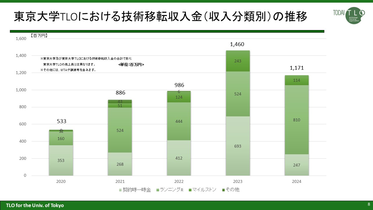 2004年の大学法人化以降、大変ありがたいことに私たちの活動が研究者に認知され、同時に「研究成果を社会に還元したい」という研究者からの期待は年々高まっています。 ライセンスの結果、企業から得られる研究成果の対価は大学や研究室に還元され、また新しい研究資金となってゆきます。 製品化情報はこちら→https://todaitlo.com/library/page/1