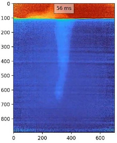 世界最大級の大型放射光施設である「SPring-8」の超高輝度X線を用いて、レーザ溶接中の金属内部の挙動の透視観察を行い、金属内部に溶接欠陥を発生させない技術開発を東京大学と行っています。写真は、高密度エネルギーのレーザにより金属が瞬時に気化してできる「レーザキーホール」の透視動画の一コマです。キーホールの断面形状を最適化することで、無欠陥溶接が可能になります。