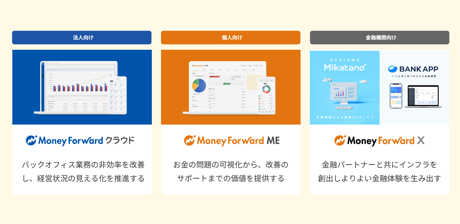 以下の主要3サービスで、事業を展開しています。 ◆Business(法人向け) バックオフィスSaaS『マネーフォワード クラウド』等を展開。会計・人事労務などの膨大なデータを扱い、企業の生産性向上と経営のDXを加速させます。 ◆Home(個人向け) 国内最大級の家計簿・資産管理アプリ『マネーフォワード ME』等を展開。PFM(Personal Financial Management)サービスとしてお金の「見える化」を実現し、個人の不安解消と資産形成をサポートします。 ◆X(金融機関向け) 金融機関等との「共創」でDXを推進。パートナーと共に新たな金融ソリューションを開発し、社会全体の金融インフラをアップデートします。