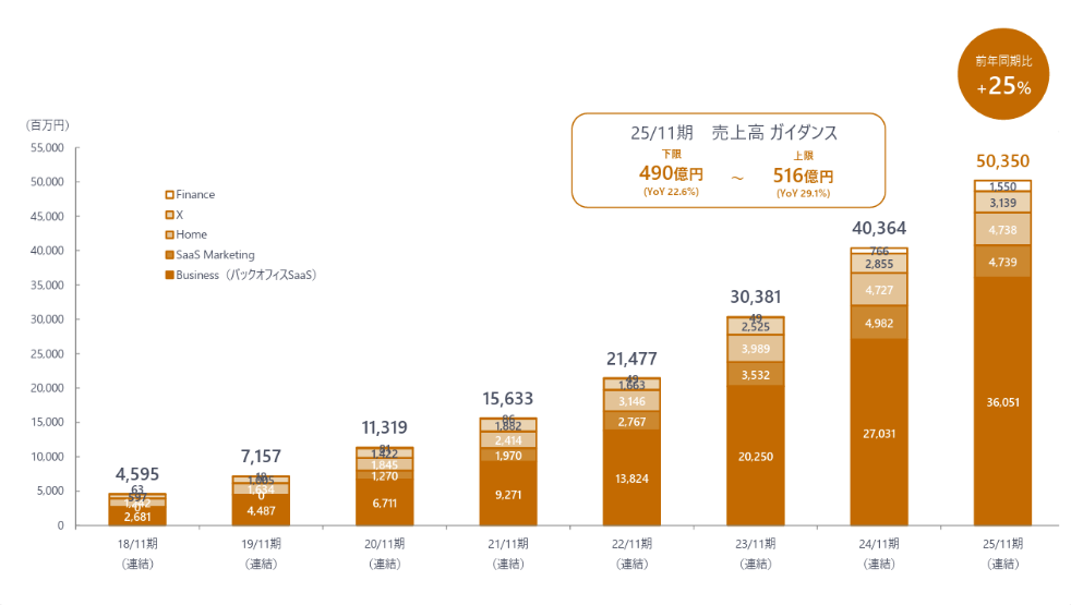 マネーフォワードは「お金を前へ。人生をもっと前へ。」というミッションのもと、社会の金融インフラを変革し続けています。 当社の最大の特徴のひとつは、創業から続く圧倒的な成長スピードです。連結売上高は2021年11月期の約156億円から、直近の2025年11月期には約503億円へと急拡大 。わずか4年で3倍以上という、驚異的な「右肩上がり」の曲線を描いています。さらに、本業の儲けを示すEBITDAも過去最高となる約49億円を記録し 、成長と安定収益を両立する強い経営基盤を確立しました。 この成長を支えるのは、法人向けSaaSや個人向け家計簿アプリなど多角的な事業ポートフォリオです 。急成長中の今だからこそ、若手のうちから裁量を持って挑戦できる機会が豊富にあります。日本を代表するSaaS×Fintech企業で、社会を動かすダイナミックな仕事を一緒にしませんか?