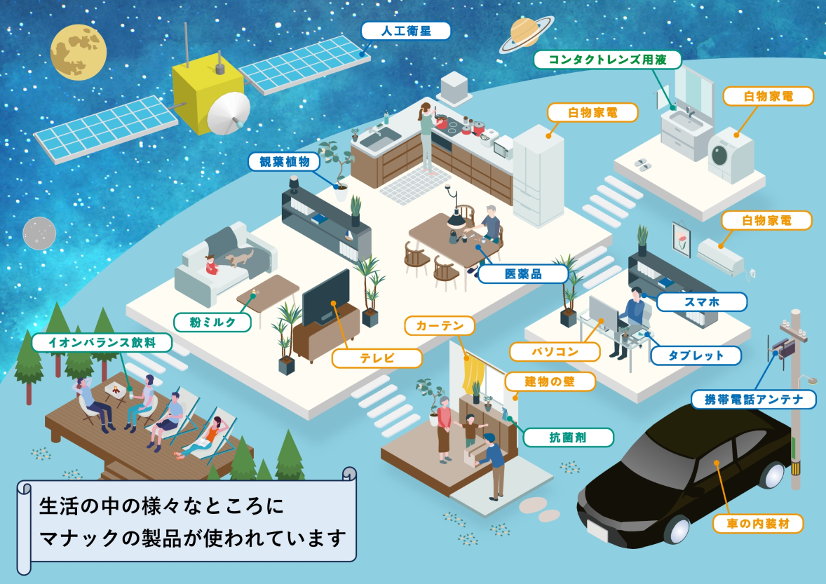 普段の生活の中でマナックの製品を目にする機会はほとんどありませんが、実は生活に身近な様々なところに当社の製品は使われていて、その中で重要な役割を果たしています。 例えば、モノを燃えにくくする特性のある難燃剤は、家電製品や断熱材の入った壁等に使用されています。また、医薬品の原薬や抗菌剤、PC・スマートフォン用の電子材料等の最先端分野の製品にも当社の製品が使われています。