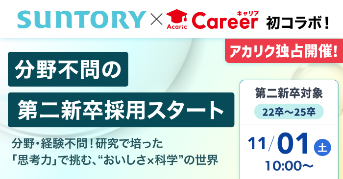 - 【アカリク独占開催】サントリーHD×アカリクキャリア 初コラボ!分野不問の第二新卒採用スタート — 商品企画10名以上を募集!